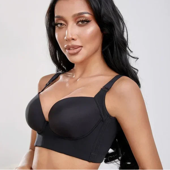 The design of 5D seamed cups, wide side wings, strong cushioned shoulder straps, and U-shape back panel ensures maximum support against sagging while smoothing back bulges and correcting armpit fats for a flattering silhouette.